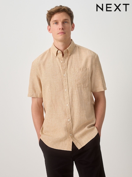 Orange Standard Collar Cotton Linen Blend Short Sleeve Shirt