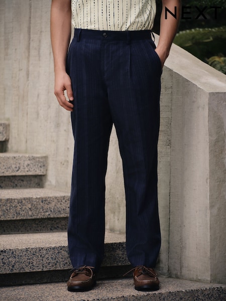 Navy Blue Relaxed Fit Textured Stripe Suit Trousers
