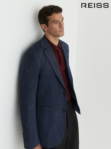 Reiss Navy Manci Single-Breasted Herringbone Blazer Tailored-Fit with Cotton