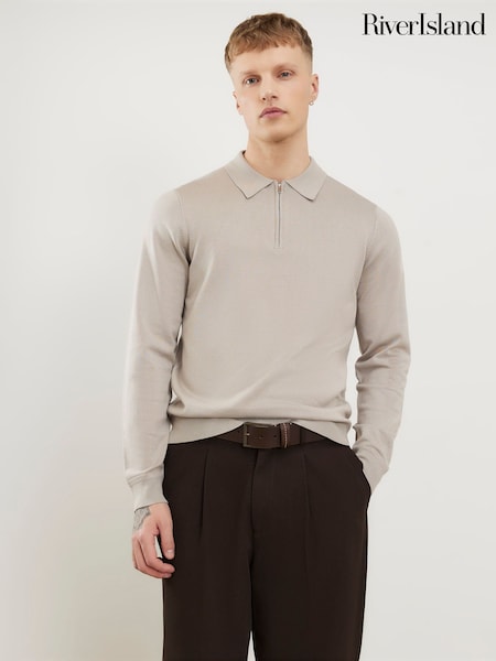 Reiss Oatmeal Elm Wool-Blend Half-Button Polo Jumper