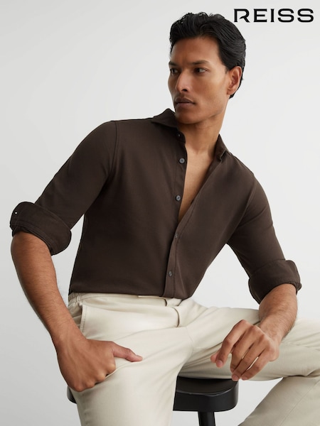 Reiss Chocolate Brown Dasilva Cotton-Piqué Garment-Dyed Shirt Regular-Fit