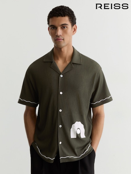 Reiss Dark Green Solano Textured Motif-Print Cuban-Collar Shirt