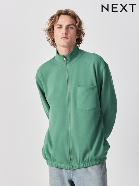 Green Tunneled Hem Lightweight Jersey Zip Through Funnel Sweat Top