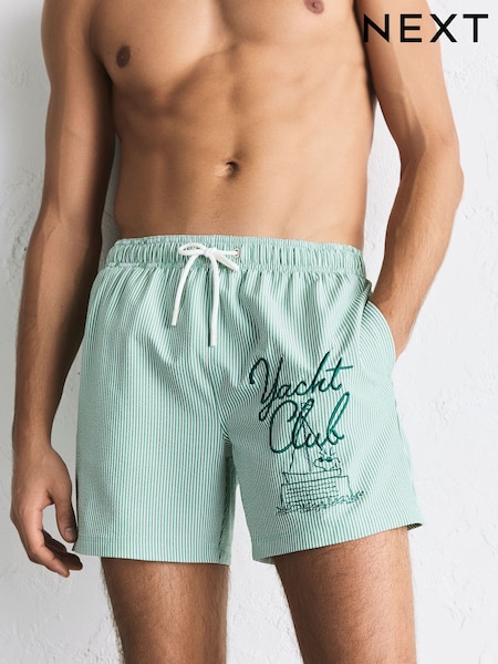 Green/White Snoopy Seersucker Striped 5 Inch Swim Shorts