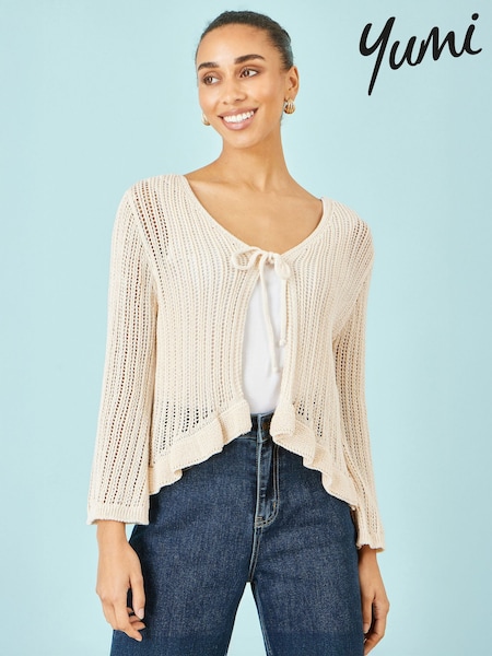 Yumi Natural Tie Front Knitted Pointelle Cardigan