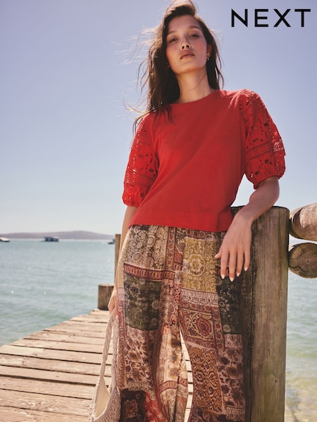 Red/Pink Border Print Short Sleeve Notch Neck Shirred Bubblehem Top