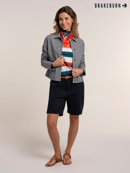Friends Like These Ecru Stripe Short Collarless Zip Through Denim Jacket