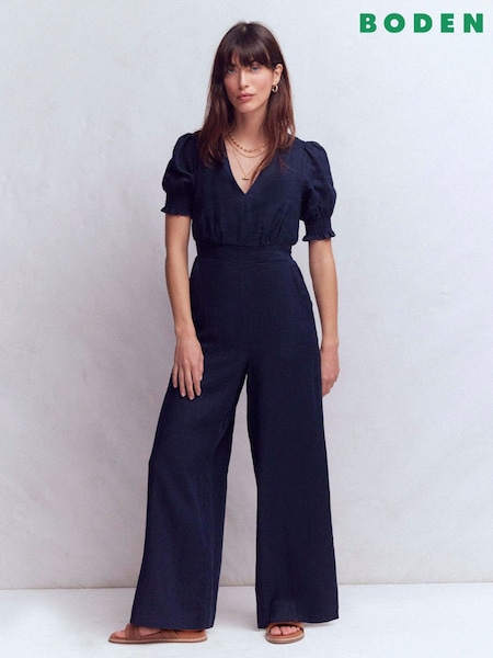 Sosandar Blue Linen Statement Belt Blend Culotte Jumpsuit