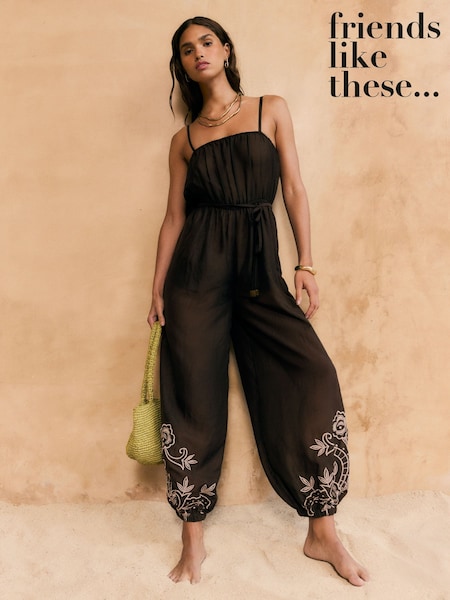 Friends Like These Chocolate Brown Embroidery Tie Waist Jumpsuit