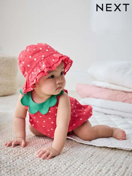 Red Strawberry Printed Woven Baby Romper and Hat Set