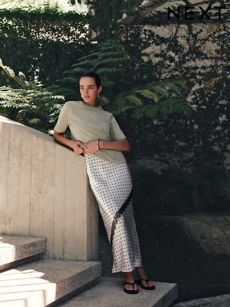 Cream/Black Spot Satin Maxi Skirt With Lace