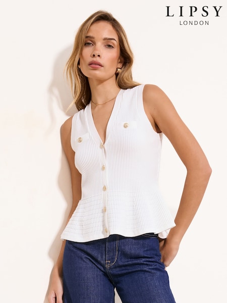 Lipsy Ivory White Buttoned Peplum Sleeveless V-Neck Knitted Waistcoat Top