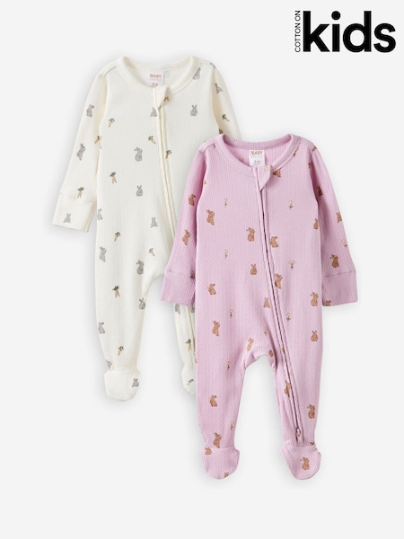 Cotton On Yellow & Purple/ Bunny Print Pointelle Zip Sleepsuits 2 Pack