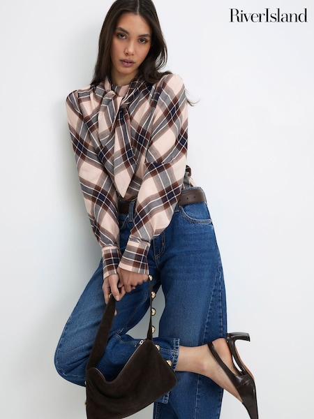 River Island Cream Long Sleeve Check Tie Neck Blouse