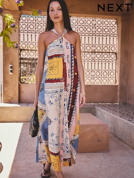 Red Scarf Printed Halter Twist Neck Midi Dress