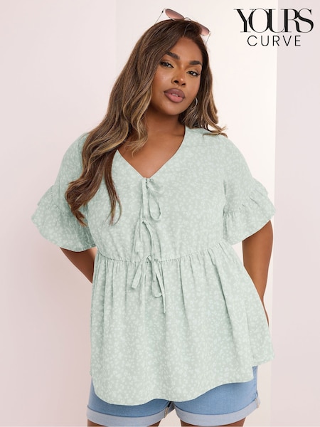 Yours Curve Green Ditsy Floral Tie Front Peplum Top