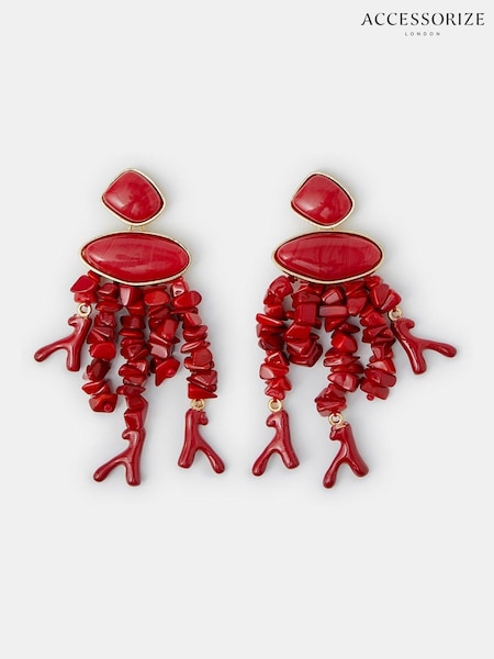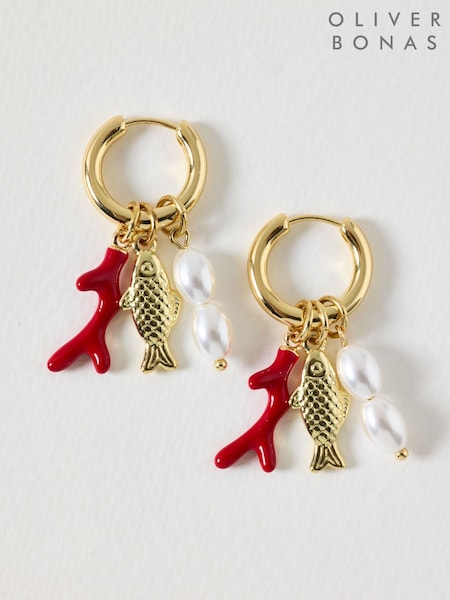 Oliver Bonas Red Fish, Coral & Faux Pearl Charm Drop Hoop Earrings