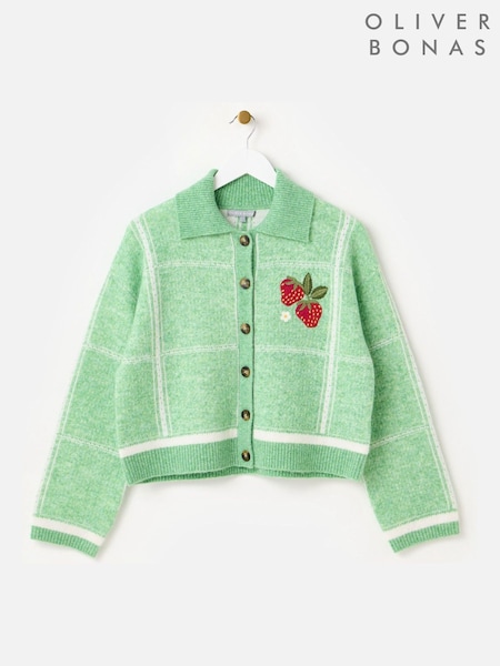 Oliver Bonas Green Checked Strawberry Embroidered Knitted Cardigan