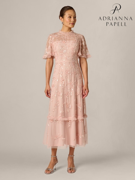 Adrianna Papell Pink Petite Ruffle Trim Bead Mesh Dress