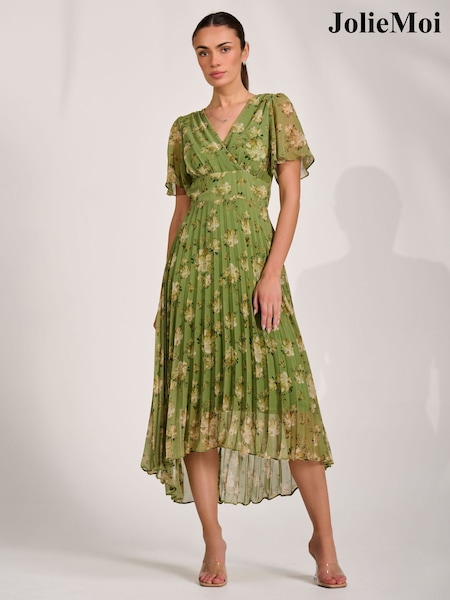 Jolie Moi Green Chiffon Pleated Dip Hem Maxi Dress