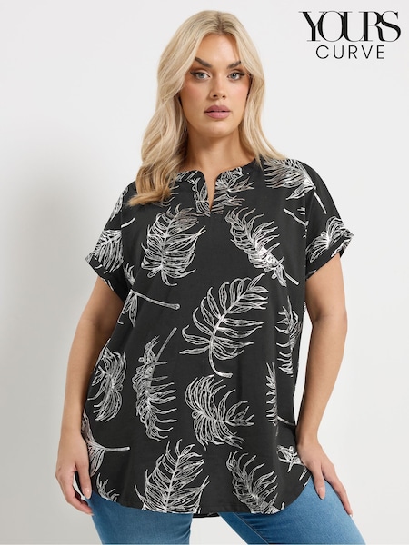 Yours Curve Black Leaf Print Notch Neck Top
