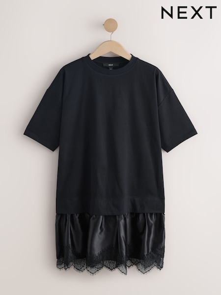 Black 2 in 1 Jersey Lace Hem T-Shirt Dress