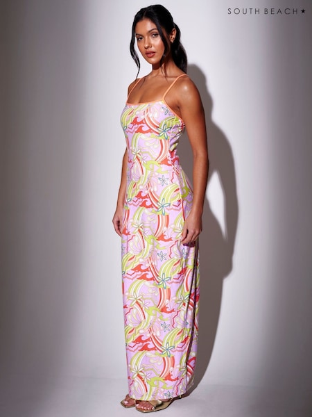 South Beach Pink Retro Printed Sequin Strappy Maxi Dress