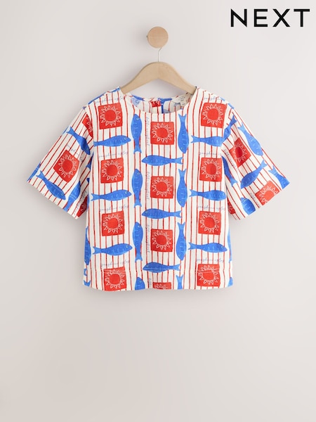 Red/Blue Stripe Fish Print Short Sleeve Boxy T-Shirt with Linen