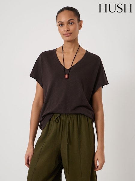 Hush Brown Rosalia Linen Blend V-Neck T-Shirt