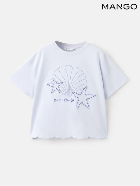 Mango Blue Scalloped Hem Seashell Embroidered T-Shirt