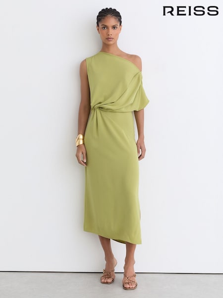 Reiss Green Beth Off-Shoulder Tuck-Detail Midi Dress