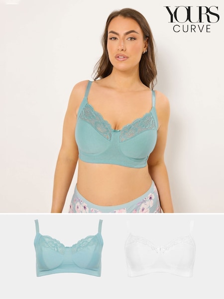 Yours Curve Blue Cotton Lace Trim Non Padded Non Wired Bralette 2 Pack