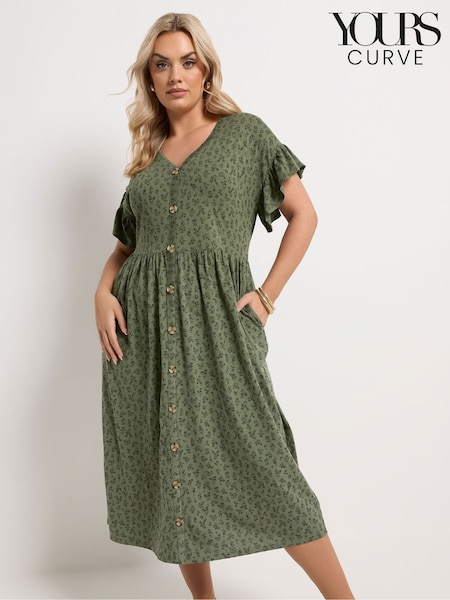 Yours Curve Green Floral Frill Sleeve Dress