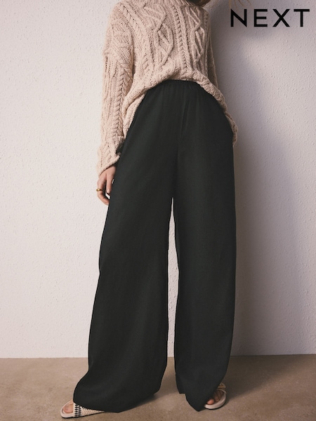 Black Textured Wide Leg Trousers with Linen