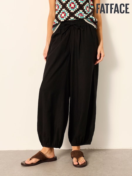 FatFace Amelia Black Linen Wide Leg Cuffed Trousers