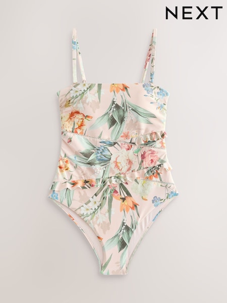 Pink Floral Ladder Insert Frill Tummy Control Bandeau Swimsuit