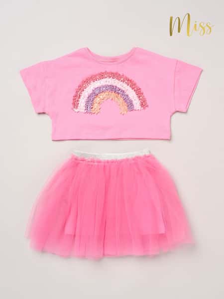 Miss Bright Pink Bow Applique Short Sleeve T-Shirt And Tutu Skirt Outfit Set
