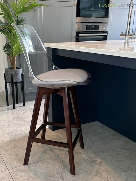 Fusion Living Light Grey Soho Clear Plastic Bar Stool with Dark Wood Legs