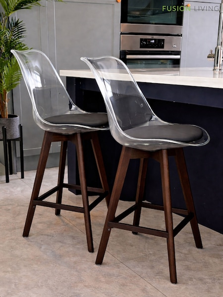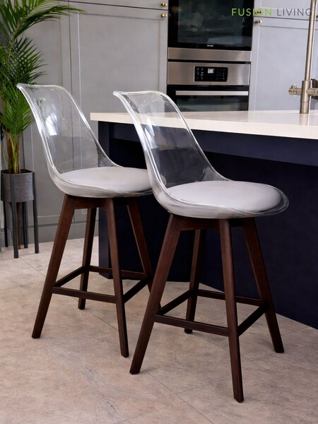 Fusion Living Set of 2 Light Grey Soho Clear Plastic Bar Stools with Dark Wood Legs