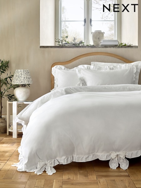 White Cotton Broderie Bows with Frill Duvet Cover and Pillowcase Set