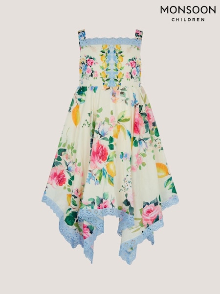 Monsoon White Amalfi Lemon Print Hanky Hem Dress