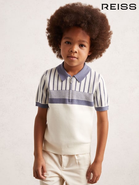 Reiss Off White/ Airforce Blue Hugo 9-13 yrs Cotton Stripe Knit Half-Zip Polo Shirt