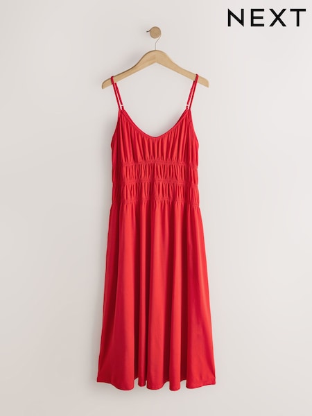 Red Shirred Strappy Jersey Midi Dress