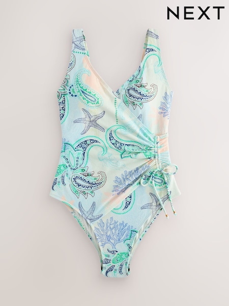 Pastel Blue/Cream Octopus Textured Ruched Side Tummy Shaping Control Swimsuit
