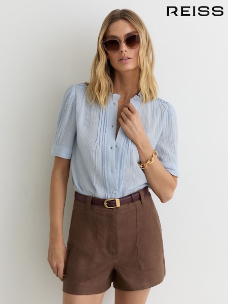 Reiss Light Blue Aurelia Cotton Cheesecloth Frill-Neck Top