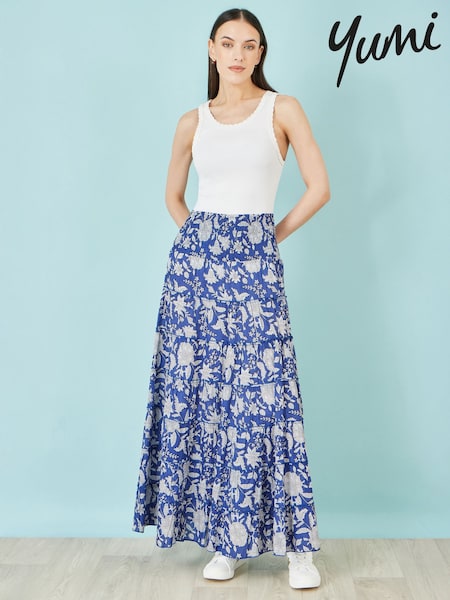 Yumi Blue Floral Cotton Tiered Maxi Skirt