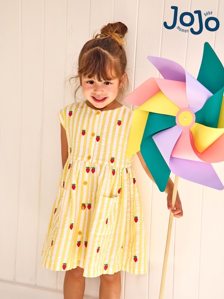 JoJo Maman Bébé Yellow Stripe Strawberry Sleeveless Embroidered Button Through Dress