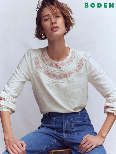 Boden Cream Rosie Embroidered Jersey Top