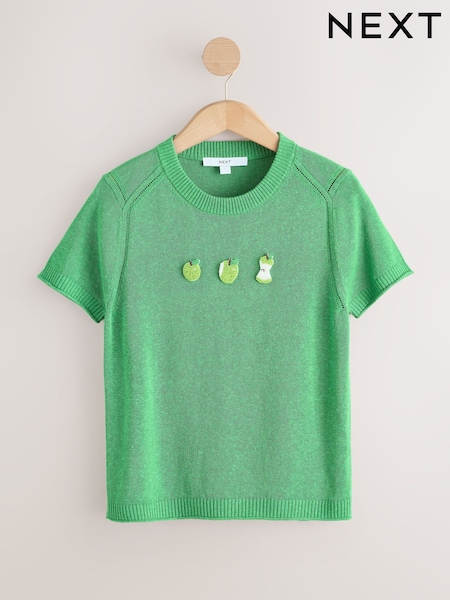 Green Fruit Embellished Short Sleeve Crew Neck Top With Linen