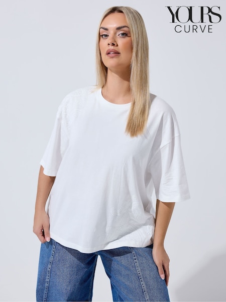 Yours Curve White Angel Sleeve Embroidered T-Shirt